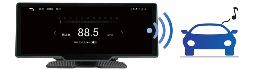 本製品と車のFMラジオの周波数を合わせることによりカーステレオから音声案内や音楽が楽しめます。