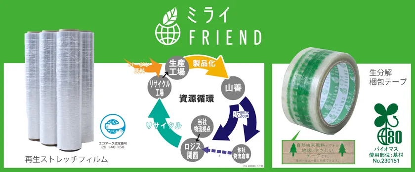 新ブランド『ミライFRIEND』が登場! 自社の物流倉庫で発生した廃ストレッチフィルムを回収し 製品として再利用する 「再生ストレッチフィルム」(2024年5月上旬)と、 パルプ原料を使用した「生分解梱包テープ」 (2024年5月中旬)を順次発売!