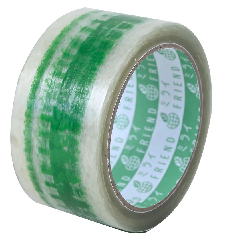 「生分解梱包テープ」は、パルプを原料としているため、段ボールから剥がさずにまとめてリサイクルすることができ、その旨をテープに明記しています。