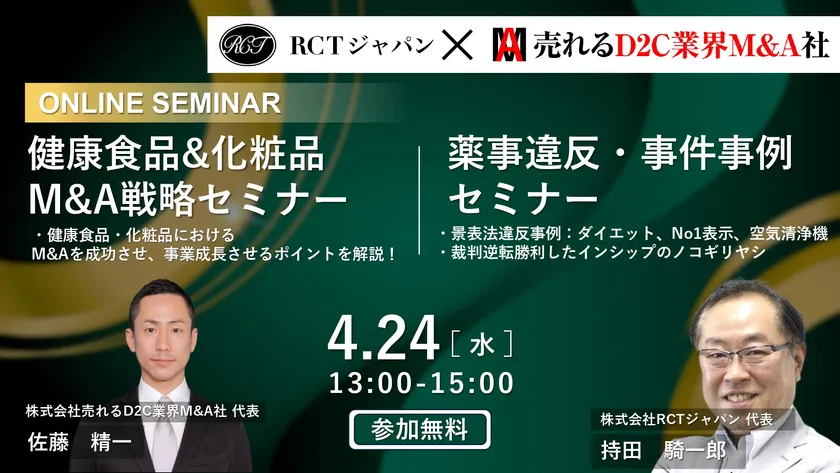 薬事通販コンサルの株式会社RCTジャパン (本社:東京都渋谷区、代表取締役社長:持田 騎一郎)は、健康食品、化粧品業界に特化したM&A仲介業の株式会社売れるD2C業界M&A社と共同で「薬事違反・事件 事例セミナー」と「健康食品&化粧品M&Aセミナー」を、2024年4月24日(水)13:00~同時開催いたします。