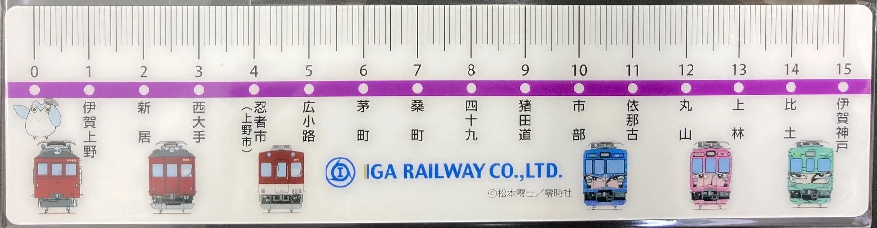 伊賀線の各駅に掲示している運賃表を基にデザインしたユニークな定規です。伊賀線の全駅数(15駅)に合わせ15cmの定規としました。伊賀線で既に引退した代表的な車両および、現役の忍者列車のイラストをデザインしました。