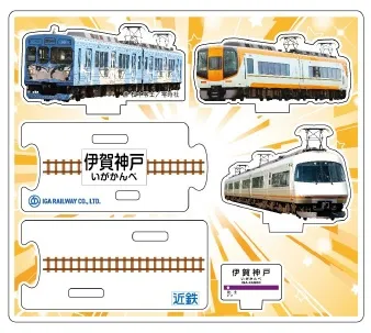 駅名標をデザインしたアクリルスタンドで、伊賀神戸駅ver.と伊賀上野駅ver.の2種類を発売します。伊賀神戸駅ver.は近鉄で運行中の特急車両2種類の写真が、また伊賀上野駅ver.はJR西日本の関西本線で運行中の車両の写真と踏切のイラストがアクリルパーツとして含まれています。なお組み立て後に連結することも可能です。