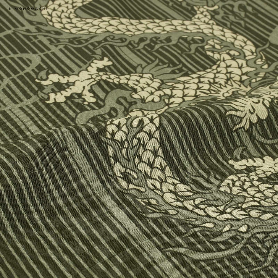 グレイッシュな黄緑の地に濃い抹茶色の細い乱れ縞。その上に、地色と同系色の線で表現された雲に白緑色の体の龍。