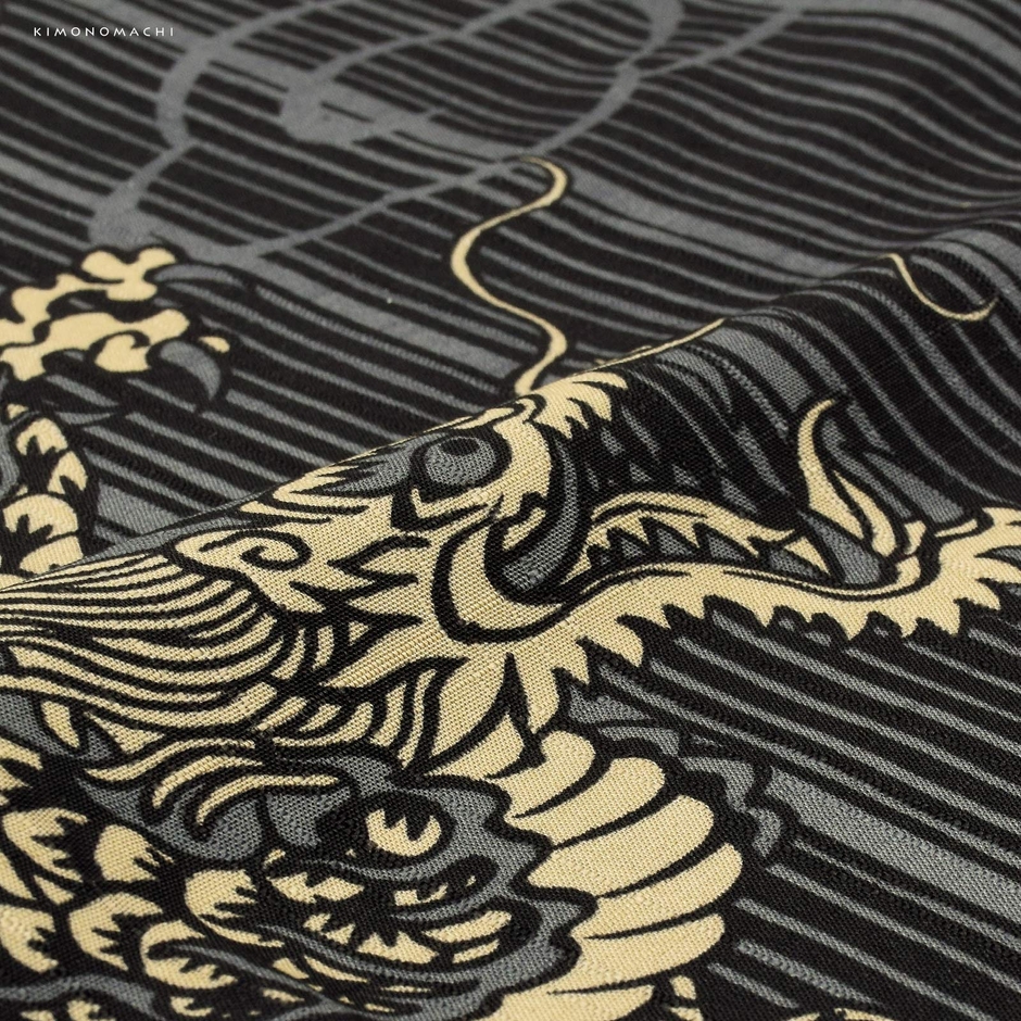 やや暗めの灰色の地に黒の細い乱れ縞。その上に、地色と同系色の線で表現された雲に生成り色の体の龍。