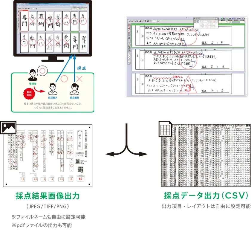 迅速に入試の「採点」を行えることに加え、「採点ミスの減少」も可能にするデジタル採点システム「YouMark」で算出された採点データを「募集入試システム」に取り込むことで、今まで時間のかかっていた「採点」から「判定会議資料の作成」までのミスを減らし、すばやく行うことが可能になりました。