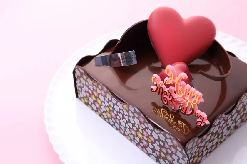 カカオの豊かな風味を楽しめるムースショコラと口どけの良いショコラ生地を10層に積み重ねた、なめらかなチョコレートケーキ。日頃の感謝の気持ちをショコラのハートで表した母の日限定のデザインです。