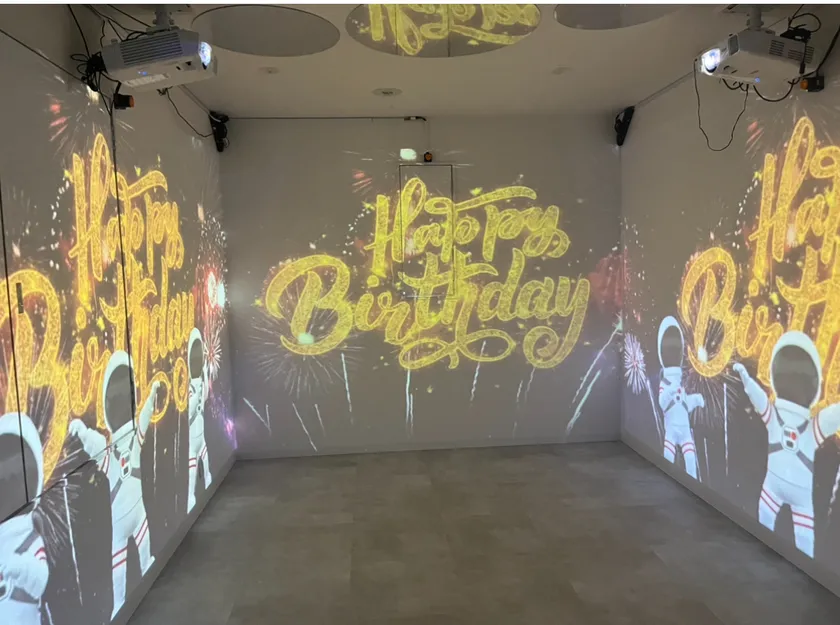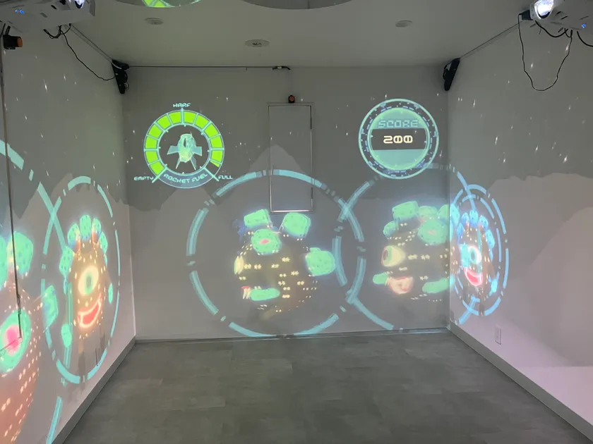 3階プロジェクションマッピングのお部屋には、昨年秋にはスマッシングエイリアンズ(次々と現れるエイリアンたちにボールを当てて攻撃するゲーム)を導入。