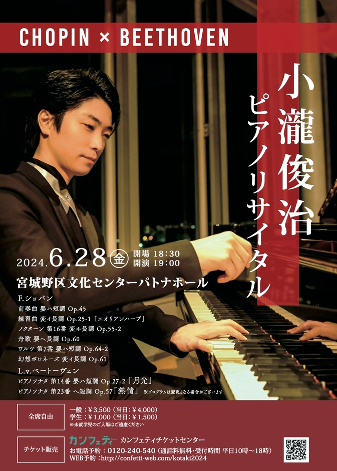 『小瀧俊治ピアノリサイタル2024 - CHOPIN × BEETHOVEN -』が2024年6月28日 (金)に宮城野区文化センター パトナホール(宮城県 仙台市宮城野区 五輪 2丁目12番70号)にて開催されます。