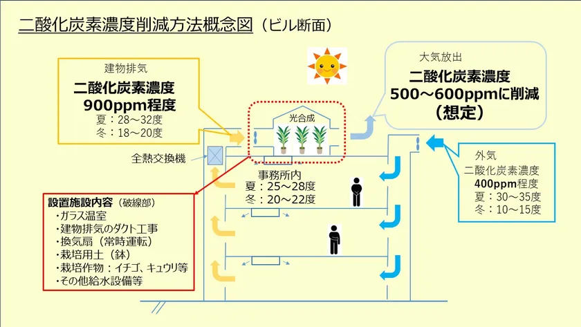 佐倉自然農園では、企業に向けて二酸化炭素削減方法を提供するサービスを本格的に開始します。これは特定建築物(床面積3,000m2以上の建物)から排出される濃度の高い二酸化炭素を屋上に設置した温室内に導き植物の光合成により消費、削減するという方法です。