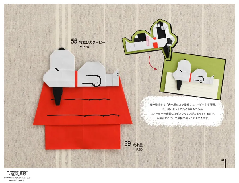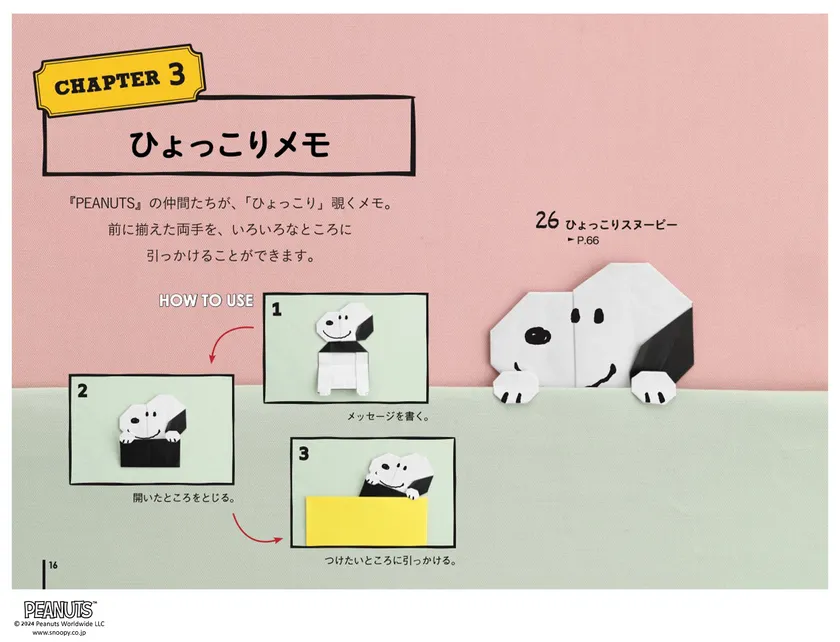 『PEANUTS』の仲間たちが折り紙になって登場しました。折ってかわいいのはもちろん、折った後も楽しめる作品を中心に掲載しています。