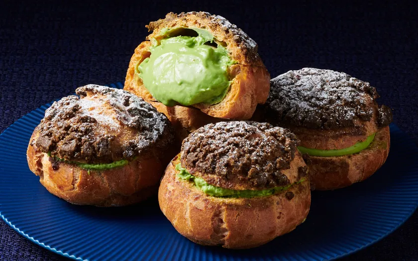 「宇治抹茶シューアラクレーム」は、宇治抹茶の旨味をぎゅっと詰め込んだカスタードクリームたっぷりのシュークリーム。北海道産バターをふんだんに使用したシュー生地に、宇治抹茶のクッキー生地をのせ、カリッと香ばしく焼き上げました。噛むたびに濃厚なバターの旨味とコクが広がります。定番スイーツを石臼挽き宇治抹茶と選りすぐりの素材で仕立てた、シェフ自慢の一品です。抹茶を味わう至福の時間をお楽しみください。