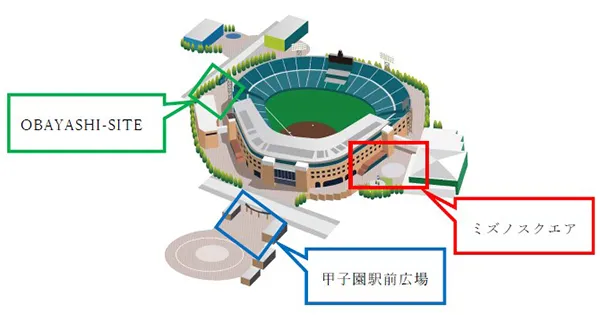 甲子園駅前広場、阪神甲子園球場外周1塁側ミズノスクエア及びレフト側OBAYASHI-SITE