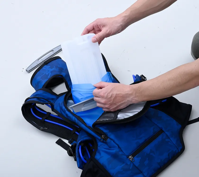 容量900mlの専用チャージボトルを付属し、使用時は最大約4時間30分(※2)冷たさが持続します。薄型ボトルのため、ペットボトル使用時のような背中の出っ張りや、椅子にもたれた際の違和感を軽減します。冷却効果が弱くなった場合は、コンビニなどで購入できる凍らせたペットボトルの使用も可能です(※3)。