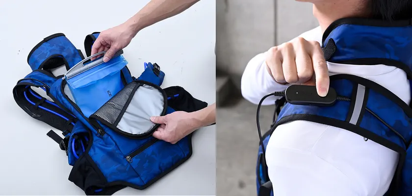 本シリーズ全体の改良点として、背中のタンクキャップをスライドキャップに変更したことで、ボトルの入れづらさを改善。また専用モバイルバッテリーに付属していた「モード切替」を、胸元の「スイッチ切替」に変更したことで、市販の5Vモバイルバッテリーを使用できるなど、使い勝手も向上させました。