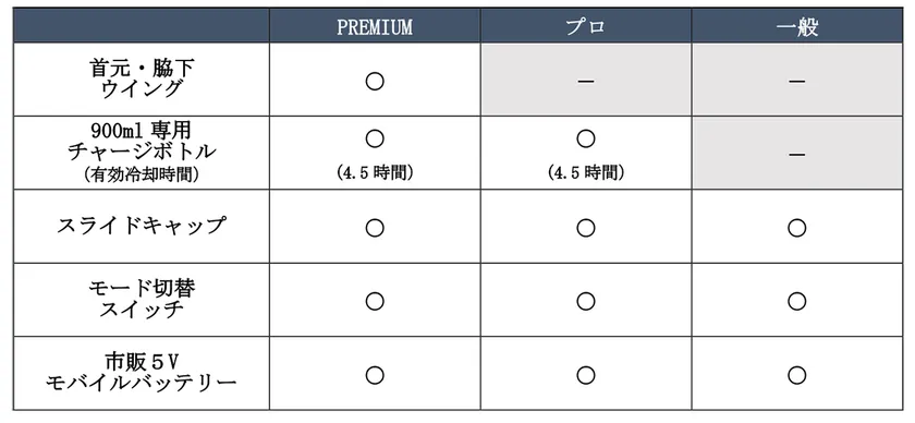 今季は、「一般」「プロ」仕様に加え、「DIRECT COOL PREMIUM」を販売します。「PREMIUM」は、脇の下に加えて、業界で初めて首元にも冷却チューブを配置(※1)した、新開発の「首元&脇下ウイング」を導入。首や脇の下には太い血管が通っているため、部位を冷やすことで、より効率良く身体を冷やします。付属する容量900mlの専用チャージボトルを使用した場合の冷却時間は最大約4.5時間です(※2)。