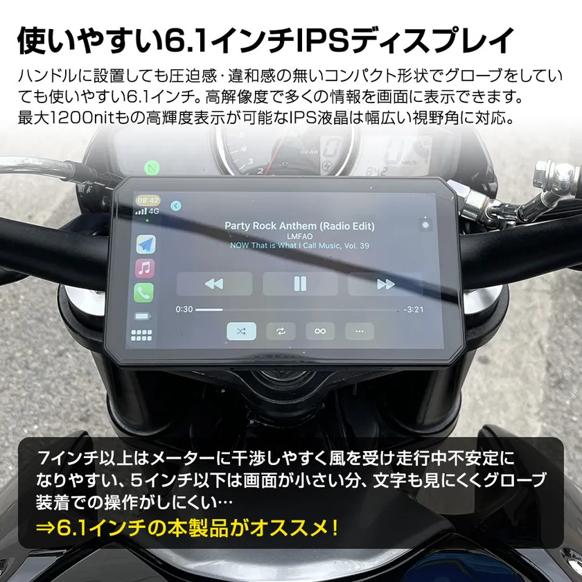 使いやすい6.1インチ画面。スマートフォンとほぼ同サイズの6.1インチ液晶サイズを採用、ハンドルに設置しても圧迫感・違和感の無いコンパクト形状に仕上げました。高解像度ディスプレイを採用することで、地図の表示情報量が多く、後方の映像もしっかり確認いただけます。