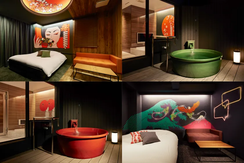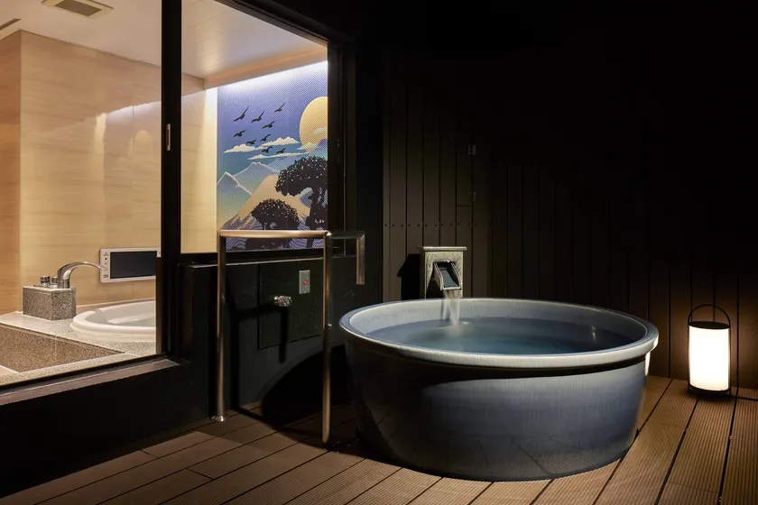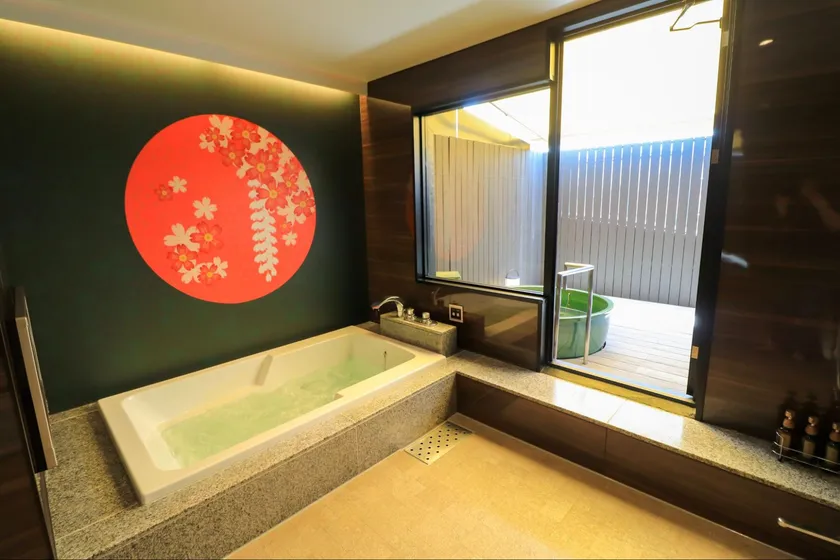名古屋ホテルHOQA花色の湯は、完全個室の露天風呂、サウナ、岩盤浴が付いた、和ポップなデザインを基調とした客室になっています。