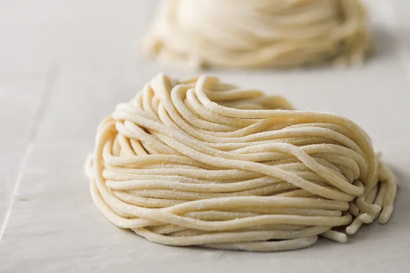 淡路島産デュラム小麦のセモリナ粉と北海道産小麦粉をブレンド。水だけで打ち上げた生地を丁寧に熟成し、直径3ミリの特注の切り刃でカットした極太麺です。