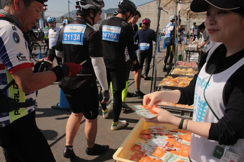 2023年12月に発売した「万田酵素プラス温 発酵しょうが」の試供品を配布し、大会参加者の健康をサポート(計3,000食分)。試食されたサイクリストの方々からは、しょうがの爽やかな風味がサイクリング中にぴったりで、しかも手軽に食べやすいと大変好評でした。