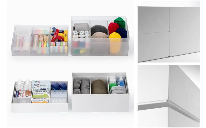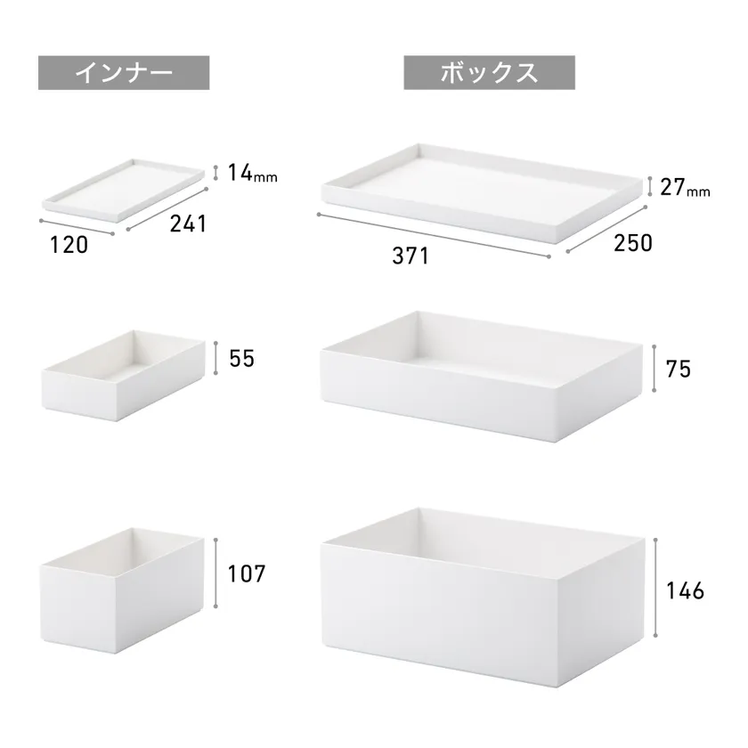 ■インナー(深型・浅型・トレー)、ボックス(深型・浅型・トレー)で組み合わせて自由に使える6型3色展開。