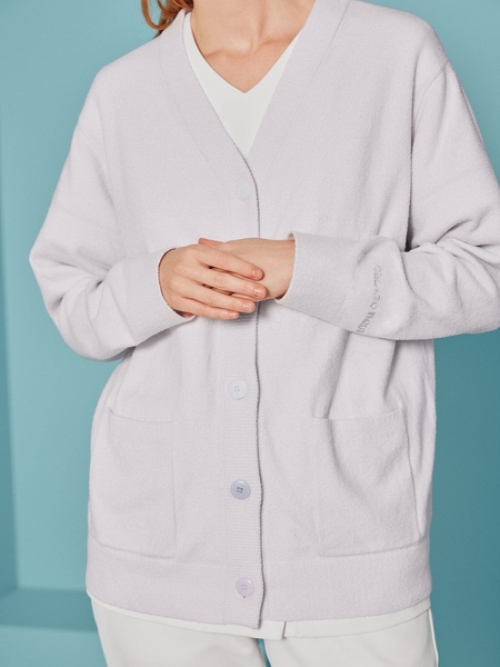 ジェラート ピケのルームウェアでも人気の‘スムーズィー’素材を使用したさらりと羽織れる軽い着心地のカーディガン。安心感を感じる柔らかく心地の良い肌触りで季節を問わず重宝するアイテムです。お尻まで隠れるロングタイプで、動きやすさを考慮した程よいドロップショルダーにしているので業務中にもピッタリ。カラーごとに異なるボタンの組み合わせとブランドのロゴ刺繍がポイントです。