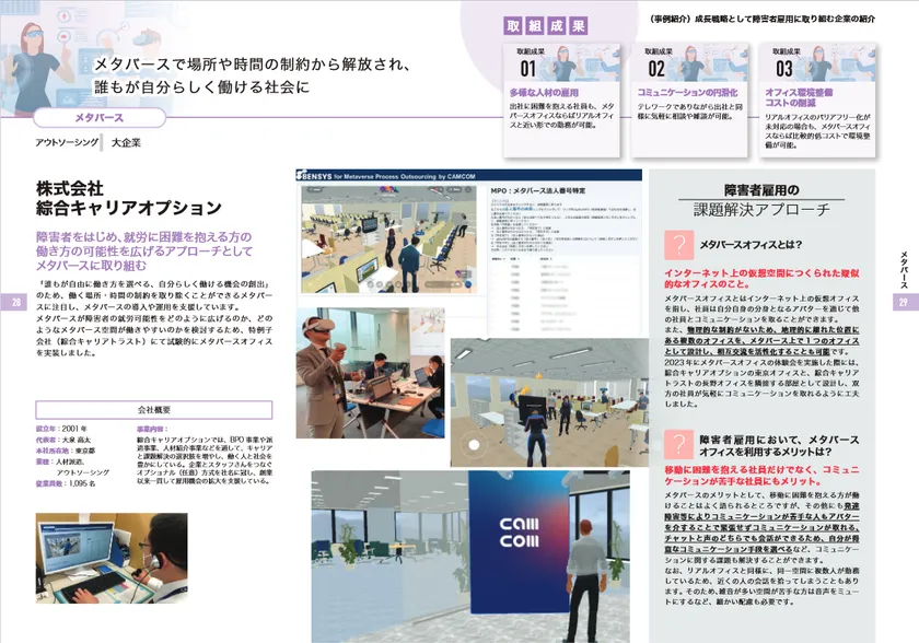 また、キャムコムグループの実践型障がい者雇用メタバースサービスの取り組みは、企業の成長戦略として障がい者の雇用に取り組む企業の実例をまとめた、東京都TOKYOはたらくネット「成長戦略としての障害者雇用~ニューロダイバーシティ型雇用の実現~」でも紹介されています。 https://hataraku.metro.tokyo.lg.jp/shogai/shien/neurodiversity/index.html