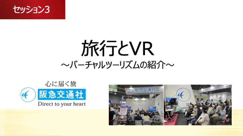 2023年10月にインテックス大阪にて開催されたツーリズムEXPOジャパン2023では、30台以上のVRゴーグルを導入し、VRたびこと講座を開催するなど、積極的にバーチャルツーリズム事業を展開している。阪急交通社が取り組むバーチャルツーリズム事業の添乗員による実演でご紹介します。