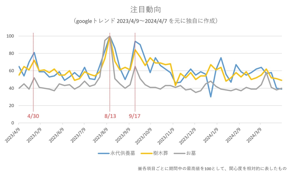 検索数から関心度の推移が分かるGoogleトレンドによると、「永代供養墓」「樹木葬」「お墓」のキーワードでの検索数が最も高まるのはお盆や秋彼岸の時期で、それに次いで高いのがゴールデンウィークであることが分かります。