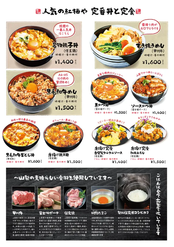 紅梅やの顔となった信玄鶏を使用した名物親子丼は臭みの少ない上質な肉と明野たまごで仕上げた絶品丼です。Instagramの投稿も多く、メディアでも度々取り上げられる人気の料理です。ほかにも定番丼や定食、また貴重な甲州牛を使用したすき焼き鍋など鍋料理もこれまで通りお召し上がりいただけます。