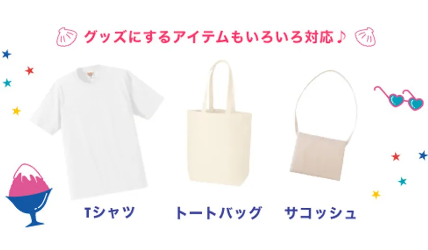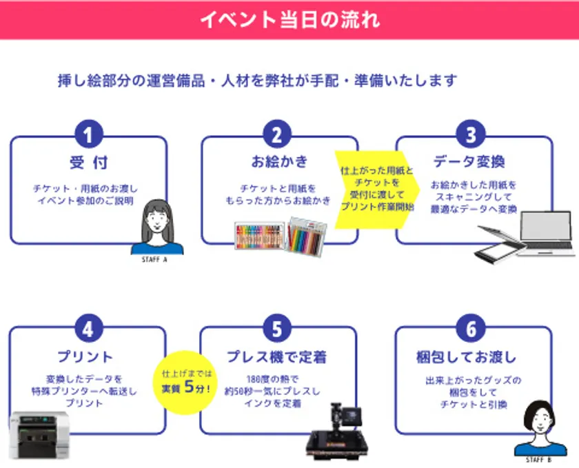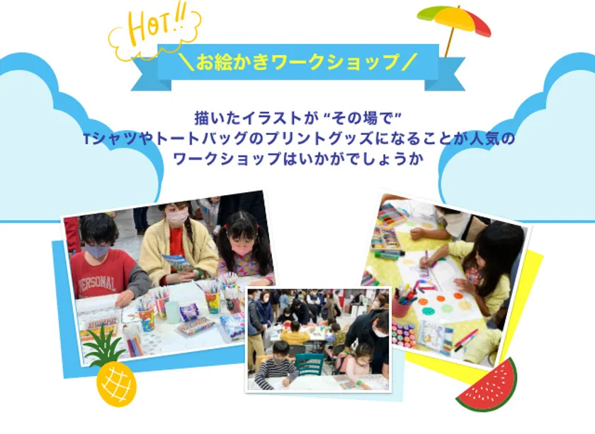 “お絵描きする楽しさ”“絵がその場で本格グッズになる驚き”“作ったグッズは使って嬉しい!”という3つのポイントとともに、たくさんお楽しみいただける体験型ワークショップイベントを提供するサービスです。