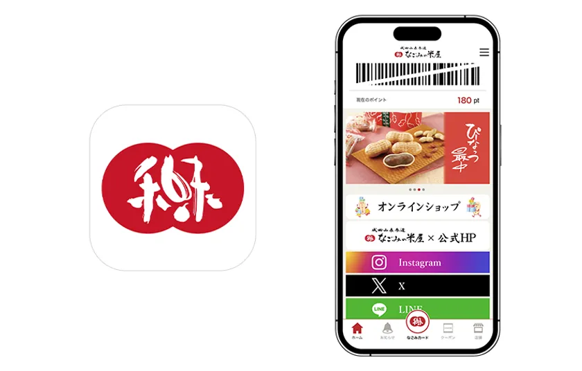 本アプリは、和菓子店『なごみの米屋』の会員向けアプリです。会員証機能を搭載し、従来のポイントカードで貯めたポイントの移行にも対応しています。店舗でのお会計金額に応じてポイントが付与され、1ポイント=1円として次回以降利用できる仕組みです。また、購買金額・来店回数に応じて会員ランクが設けられており、ランクアップするとポイント付与率が上がります。(そごう千葉店、東武百貨店船橋店、オンラインショップはポイント・会員ランク制度の対象外です。)