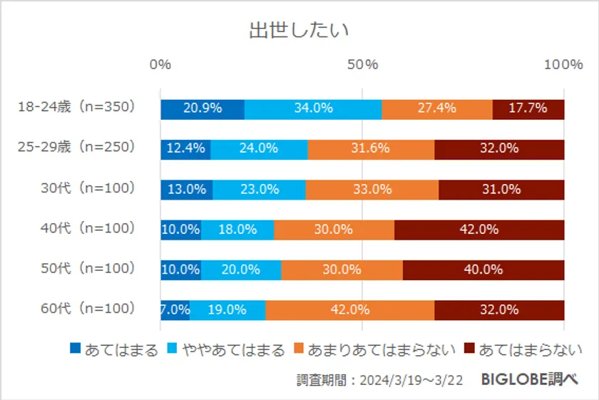 「出世したい」5割強、出世願望が一番強いのは24歳までの若年層 「あしたメディア by BIGLOBE」が 若年層の働き方に関する意識調査を発表 ~「在宅勤務ができる会社で働きたい」若い世代ほど多く、7割強~