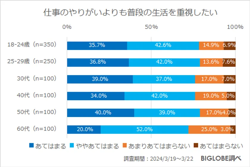 全国の18歳から69歳までの男女1,000人に、働き方に関して複数の質問を行った。(現在働いていない人も、自身の意識としてあてはまるものを回答)「仕事のやりがい」と「普段の生活」については、「仕事のやりがいよりも普段の生活を重視したい」と回答した人は「あてはまる」、「ややあてはまる」をあわせ、全ての年代で7割を超える結果となった。