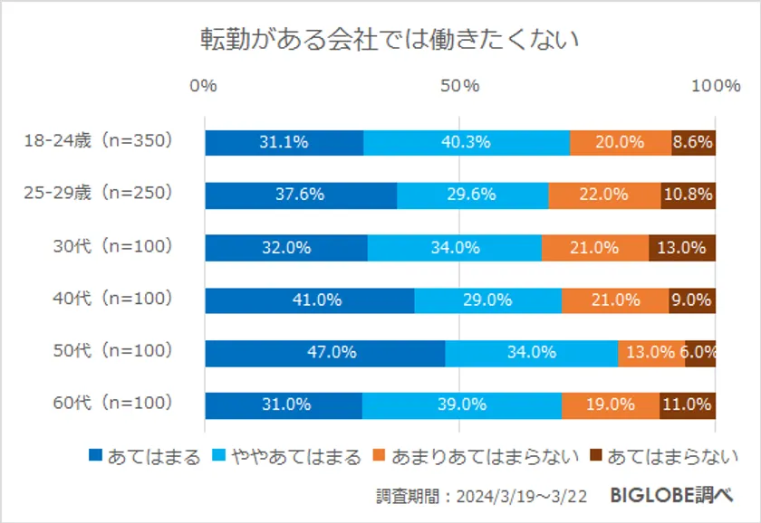 また、転勤や単身赴任制度を見直す企業がある中、「転勤がある会社では働きたくない」と回答した人は、「あてはまる」、「ややあてはまる」をあわせ、全年代で6割を超える結果に。18歳から24歳の若年層では、71.4%となった。