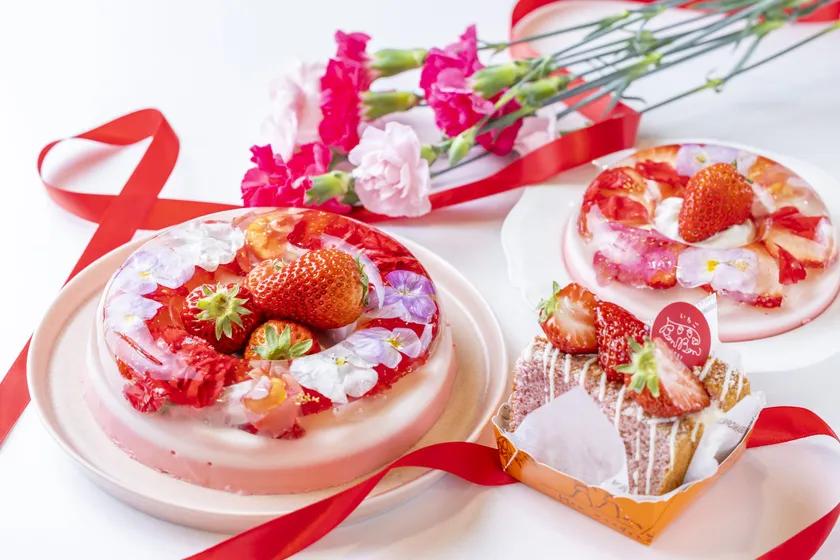 エディブルフラワーをふんだんに使用したまるで花束のような華やかないちごスイーツは、日頃の感謝を込めた贈りものにぴったりです。旬のなごりを迎える地元・伊豆の国市産のいちごを使用しました。母の日限定で、通販で全国のお客様にもお届けいたします。