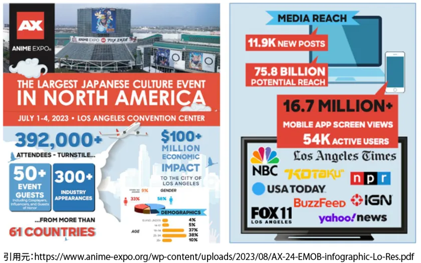 「Anime Expo」は全米で最大規模のアニメ展示会。近年ではアニメ声優、歌手、ダンスグループ、日本人アーティストが日本から参加し、これらのゲストを招いたパネルディスカッションや、サイン会、新作アニメーション映画の上映が行われています。40万人近くが来場し、ニュースメディアだけでなくネットメディアでの巨大な拡散が期待できる、北米最大の「日本カルチャー」イベントとなっています。