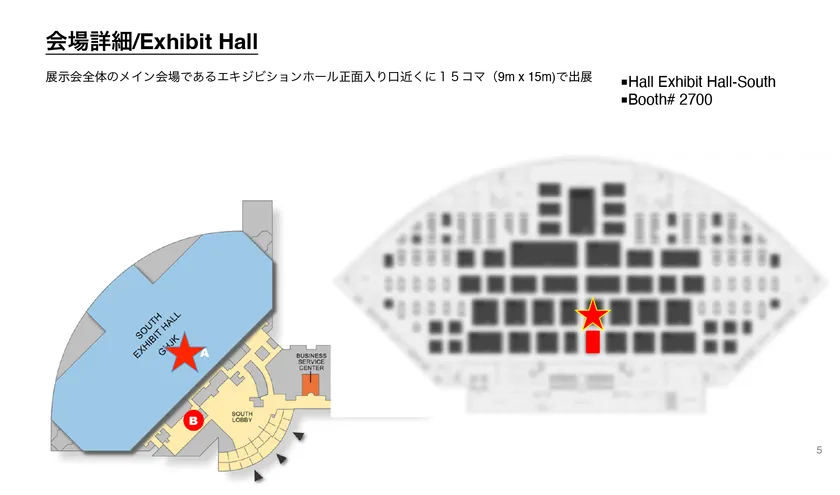 来場者・出展社ともに激戦区であるExhibit Hallの正面入り口前に15コマブース(約9m×15m)で日本パビリオンを開催します。