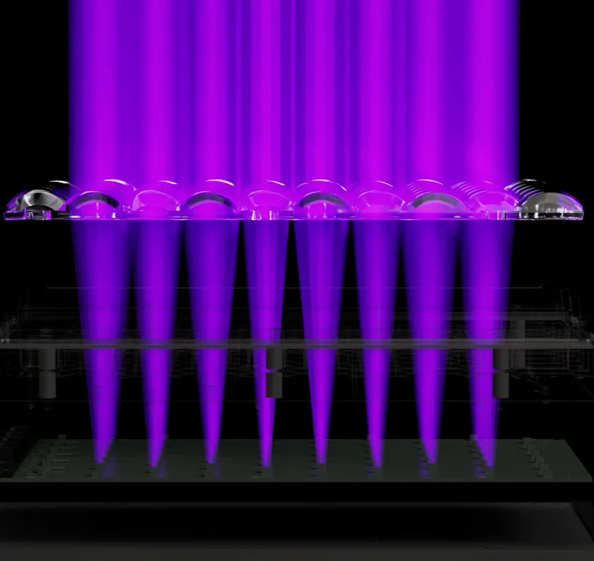 バックライトユニットは60個ものLEDから照射される高出力光をバッフル板とレンズアレイを通すことで均一かつ並行な照射を実現し、高速造形、精度、品質を保証します。