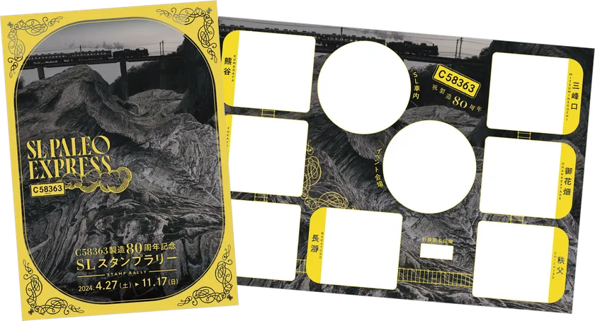 傘寿を象徴する「濃黄色」を使用し、C58363の長い歴史を表現したスタンプ台紙に、SL停車駅やSL車内、指定イベント会場をめぐってスタンプを集めます。