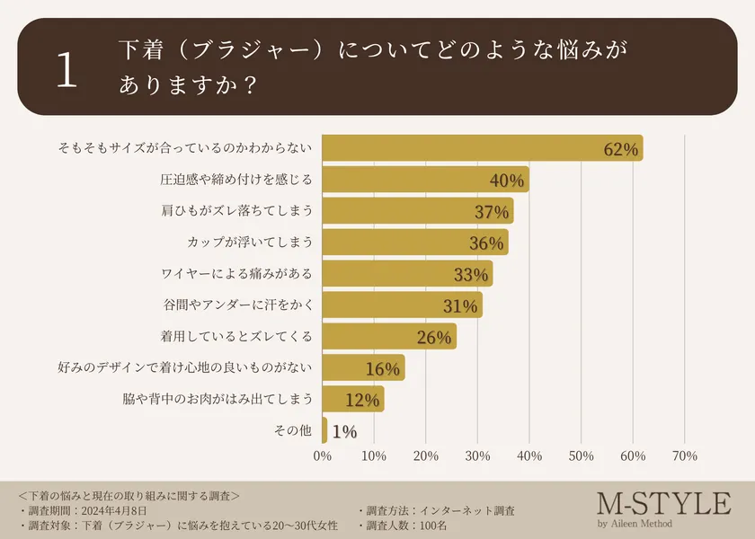 アイリーン式育乳マッサージで一躍有名となった美容家「神長アイリーン」が所属するバストアップ専門エステティックサロン「M-STYLE( https://ay-company.com/ )」は、下着に悩みを抱えている20~30代の女性を対象に下着の悩みと現在の取り組みに関する調査を実施しました。
