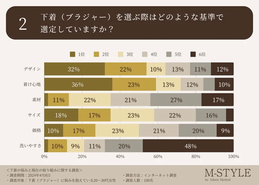 「デザイン」と回答した方も次いで多い結果になり、「着け心地がよく、且つデザインも好みのものを優先的に選びたい」という女性のホンネが伝わってきます。