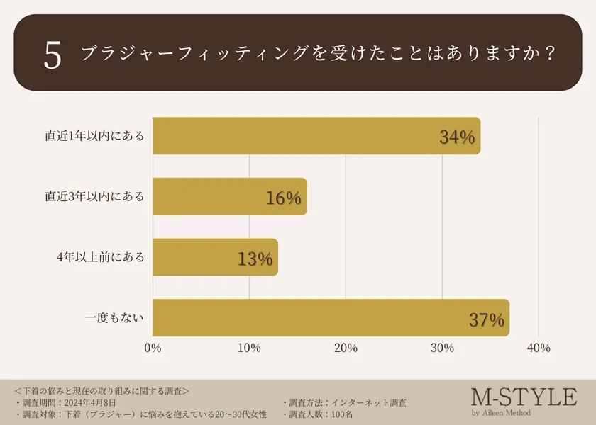 次に、ブラジャーフィッティングを受けたことがあるか伺ったところ、「一度もない(37.0%)」「直近1年以内にある(34.0%)」「直近3年以内にある(16.0%)」「4年以上前にある(13.0%)」という回答が集まりました。