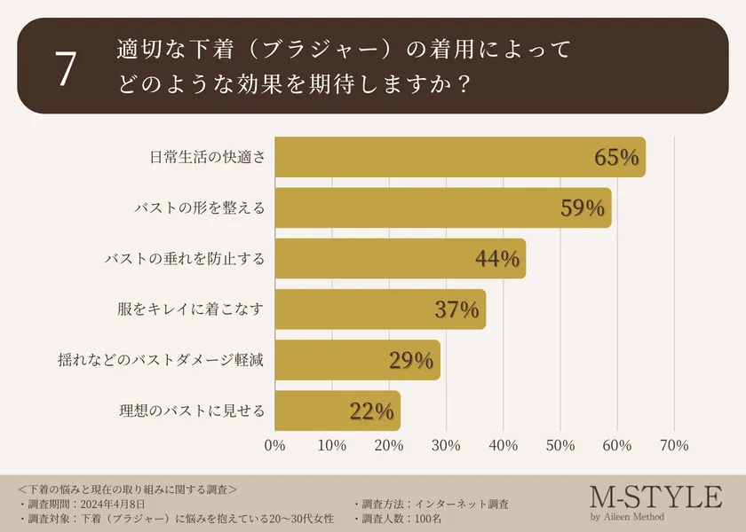 最後に、適切な下着(ブラジャー)の着用によってどのような効果を期待しているか伺ったところ、「日常生活の快適さ(65.0%)」「バストの形を整える(59.0%)」「バストの垂れを防止する(44.0%)」「服をキレイに着こなす(37.0%)」という回答が集まりました。