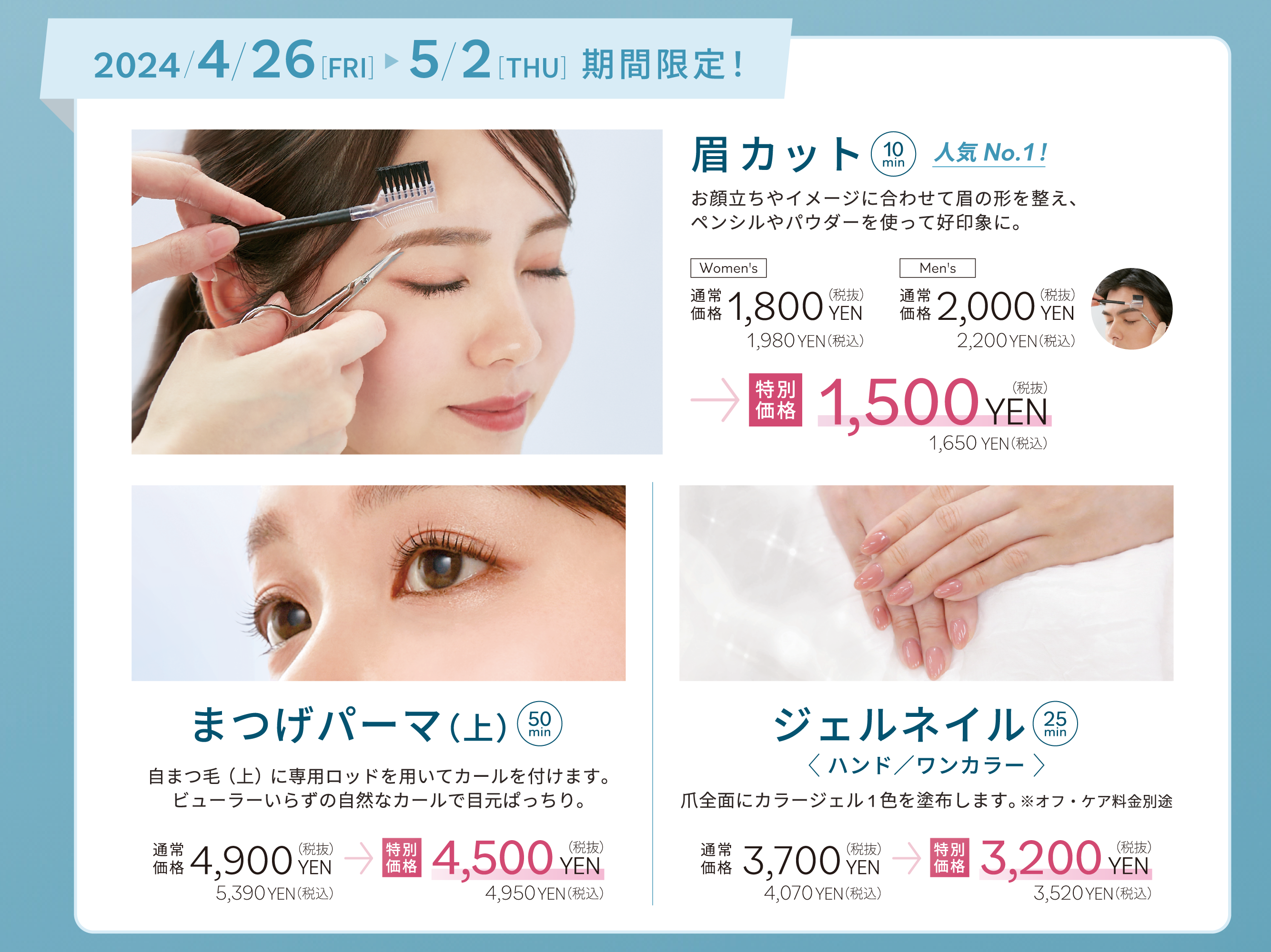 人気No.1メニュー「眉カット」がオープン特別価格1,500円+税! その他まつげパーマやジェルネイルも特別価格でご提供!