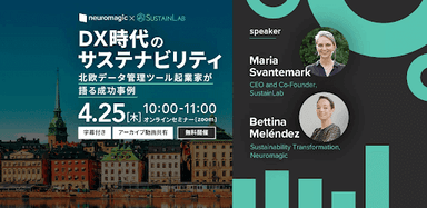日本語版のリリースを記念しオンラインセミナーを無料で開催いたします。欧州最大の冷凍食品企業でサステナビリティ・マネージャーを務め、現在はSustainLab社のCEOおよび共同設立者のマリア・スヴァンテマルクと当社のSXグループリーダーであるベッティーナ・メレンデスが登壇し、北欧企業の「サステナビリティ・データを活用した成功事例」を紹介。AI技術を活用したデータ収集や分析、SustainLabについてもご紹介します。