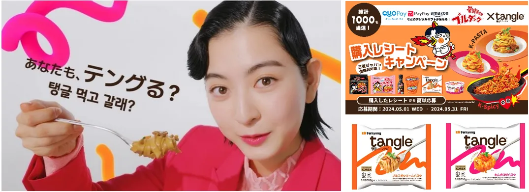 株式会社三養ジャパン(サムヤンジャパン)(本社:東京都千代田区、代表取締役:洪 範準)は、2024年2月に発売以降、好評発売中の「tangle(テングル)」WEB動画「沼る食感、K-パスタ」をYouTube上で公開しています。また、5月1日(水)からは「QUOカードPay」や、「選べるデジタルギフト」が1,000名様に当たるキャンペーンを実施します。本動画には、モデル・女優として活躍中で、「仮面ライダーゼロワン」にも出演した成田愛純さんが登場。「tangle(テングル)」を一口食べると、その新食感に手が止まらなくなり、幸せそうに頬張る姿に注目です。