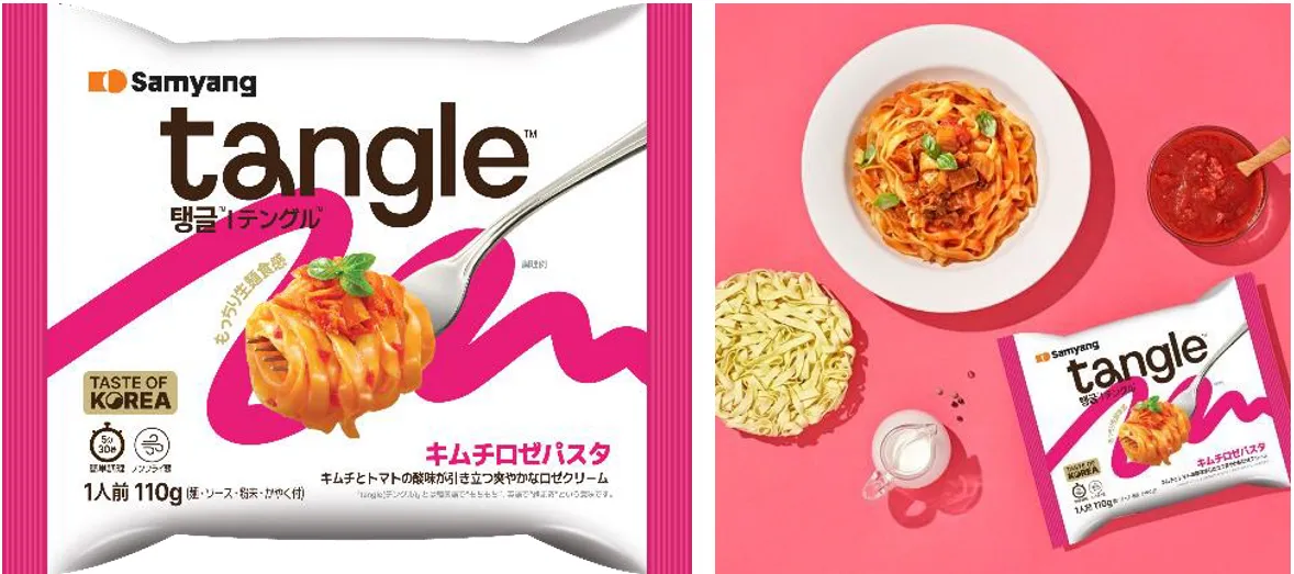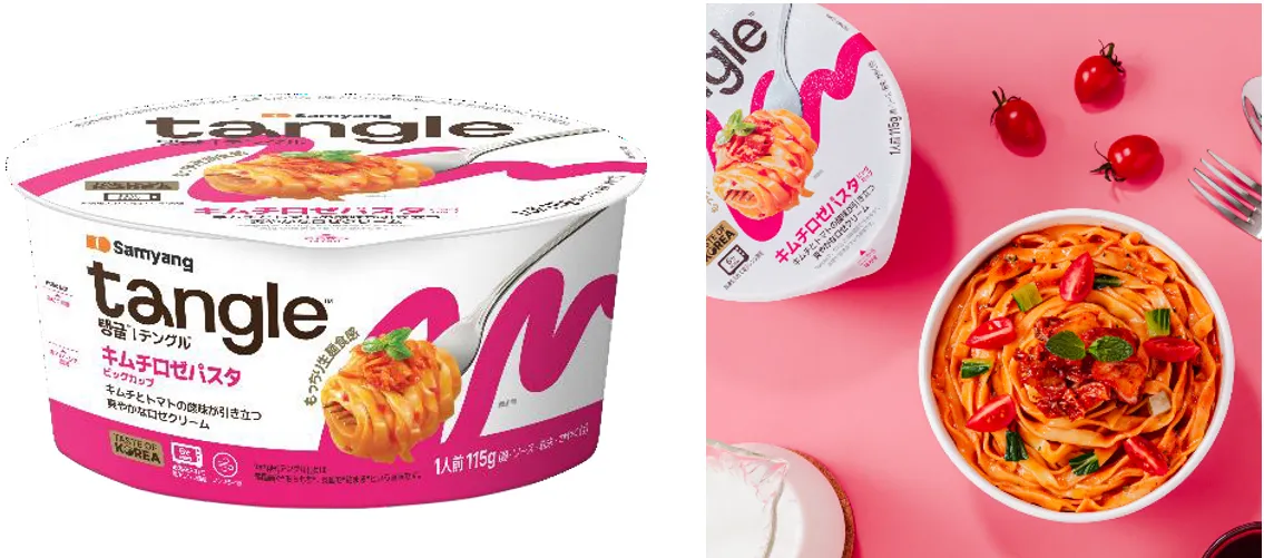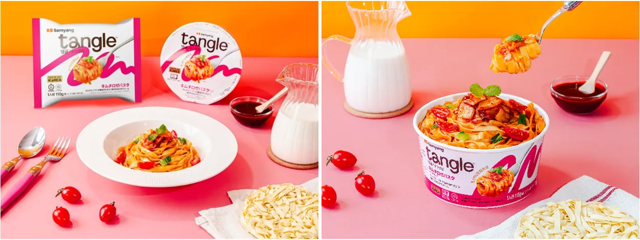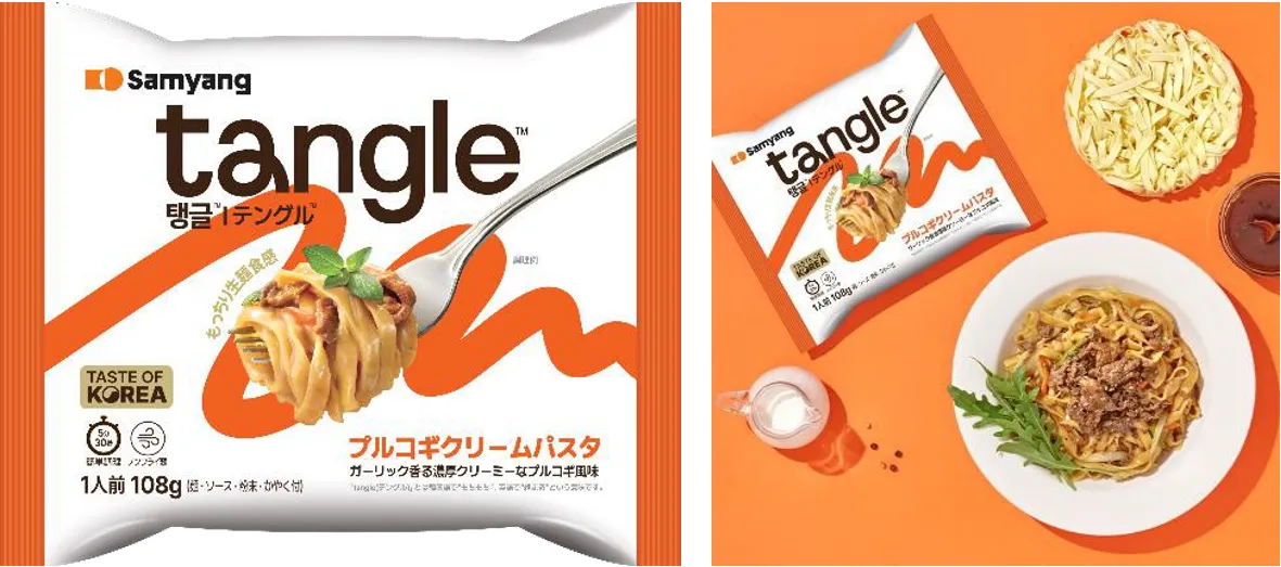 三養ジャパンより登場した、韓国発の次世代パスタ「tangle(テングル)」。tangle(テングル)とは韓国語で"もちもち"、英語で"絡まる"という意味です。エアドライ製法で作られたノンフライ麺で、もっちり生麺食感のフェットチーネに。ソースの味は、韓国の定番料理としておなじみの「プルコギ」をモチーフにした「プルコギクリーム」味と、キムチとクリームを混ぜて作った「キムチロゼ」味の2種類を用意しました。もちもちの麺に、クリーミーなソースが絡む「K-パスタ」(韓国風パスタ)です。