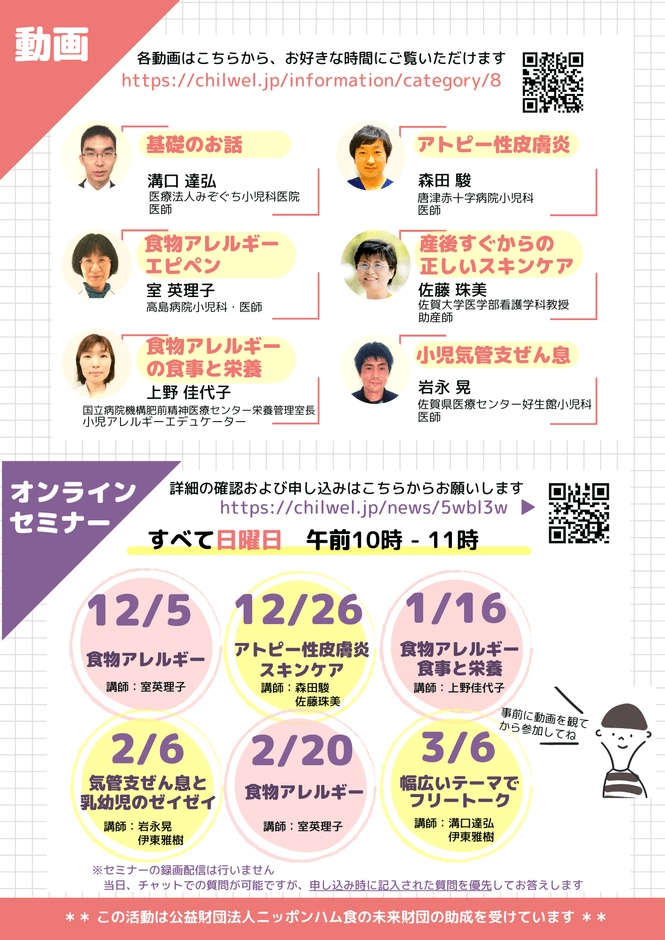 さらに動画を視聴した人を対象に、2021年12月6日(日)から2022月3月6日(日)にかけて、全6回にわたってオンラインセミナーを開催します。セミナーでは、小児アレルギーの専門医などが、動画の内容に関して事前に寄せられた質問にお答えするほか、時間に余裕があれば当日もチャットでの質問にお答えします。 保護者はもちろん、園や学校の先生、子育て支援に携わる方、飲食業の方など、どなたでもご参加いただけます。