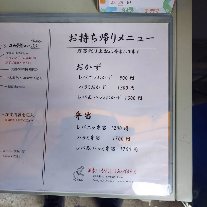 テイクアウト用のメニュー