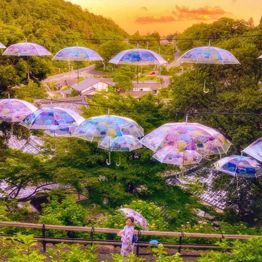 美しい境内のあじさいと空を彩る紫陽花の傘のコラボをお楽しみいただけます。